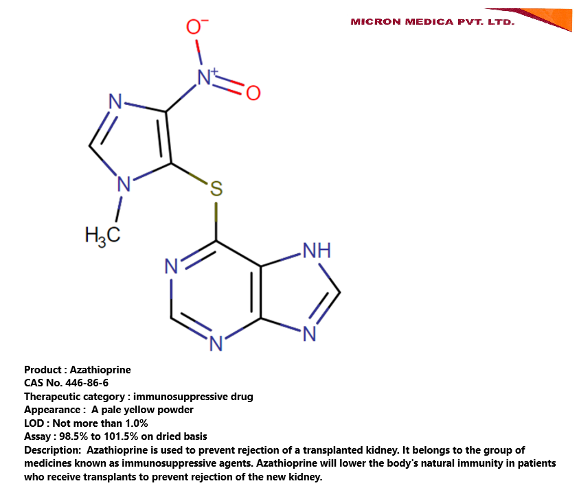 Azathioprine is used to prevent rejection of a transplanted kidney. It belongs to the group of medicines known as immunosuppressive agents. Azathioprine will lower the body’s natural immunity in patients who receive transplants to prevent rejection of the new kidney.