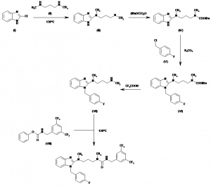 N’-[3,5-Bis(trifluoromethyl)benzyl]-N-[3-[N-[1-(4-fluorobenzyl)benzimidazol-2-yl]-N-methylamino]propyl]-N-methylurea hydrochloride | 215583-22-5 | C29H28F7N5O.ClH |