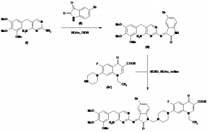 7-[4-[3-[4-Amino-5-(3,4,5-trimethoxybenzyl)pyrimidin-2-ylimino]-5-bromo-2-oxo-2,3-dihydro-1H-indol-1-ylmethyl]piperazin-1-yl]-1-ethyl-6-fluoro-4-oxo-1,4-dihydroquinoline-3-carboxylic acid | C39H38BrFN8O7 |