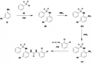 N-[5-Cyano-2-[3-(2,3-dichlorophenyl)ureido]phenyl]benzenesulfonamide; N-[4-Cyano-2-(phenylsulfonamido)phenyl]-N’-(2,3-dichlorophenyl)urea | 210358-37-5 | C20H14Cl2N4O3S |