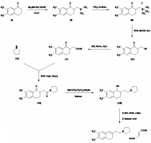 1-[2-(6,7-Dimethyl-3,4-dihydro-2-naphthalenyl)ethyl]pyrrolidine fumarate | 184638-09-3 (free base); 184639-27-8 (hydrochlorid | C18H25N.C4H4O4 |