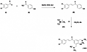 (E)-1-[3,5-Bis(dimethylaminomethyl)-4-hydroxyphenyl]-3-(3,4-dichlorophenyl)-2-propen-1-one dihydrochloride | C21H24Cl2N2O2.2ClH | |