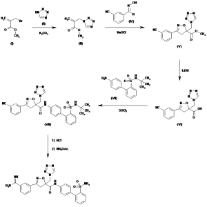 2-[6-[3-(3-Amidinophenyl)-5-(1-tetrazolylmethyl)-4,5-dihydroisoxazol-5-ylcarboxamido]pyridin-3-yl]benzenesulfonamide trifluoroacetate | 193005-21-9 ((-)-enantiomer, free base); 193005-20 | C24H22N10O4S.C2HF3O2 |