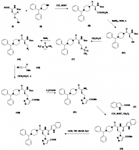 1-[4-[4-(Diphenylmethyl)piperazin-1-yl]-3(S)-(1H-indol-2-ylcarboxamido)-4-oxobutyl]-1,2,3-triazole-5-carboxylic acid | 178612-35-6 | C33H33N7O4 |