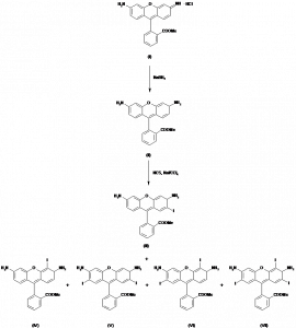 2-(3′,6′-Diamino-2′-iodo-9H-xanthen-9′-yl)benzoic acid methyl ester | 109244-59-9; 109244-63-5 (125I-labeled) | C21H17IN2O3 |