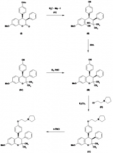(?)-trans-1-[2-[4-(7-Methoxy-2,2-dimethyl-3-phenyl-3,4-dihydro-2H-1-benzopyran-4-yl)phenoxy]ethyl]pyrrolidine; (?)-trans-7-Methoxy-2,2-dimethyl-3-phenyl-4-[4-(2-pyrrolidinoethoxy)phenyl]chromane; (?)-trans-1-[2-[4-(7-Methoxy-2,2-dimethyl-3-phenyl-4-chro |