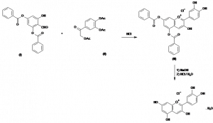 2-(3,4-Dihydroxyphenyl)-3,5,7-trihydroxy-1-benzopyrylium chloride monohydrate; 3,3′,4′,5,7-Pentahydroxyflavylium chloride monohydrate | 000528-58-5 (anhydrous) | C15H11O6.Cl.H2O |