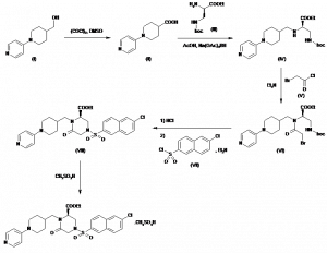 4-(6-Chloronaphthalen-2-ylsulfonyl)-6-oxo-1-[1-(pyridin-4-yl)piperidin-4-ylmethyl]piperazine-2(R)-carboxylic acid ethyl ester methanesulfonate | 229647-00-1; 229647-01-2 ((S)-isomer); 229646-73-5 | C28H31ClN4O5S.CH4O3S |