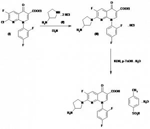 (±)-7-(3-Amino-1-pyrrolidinyl)-1-(2,4-difluorophenyl)-6-fluoro-4-oxo-1,4-dihydro-1,8-naphthyridine-3-carboxylic acid p-toluenesulfonate monohydrate | 115964-29-9; 107097-79-0 (free base); 108138-46-1 | C19H15F3N4O3.C7H8O3S.H2O |