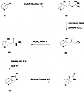 (S)-Spiro[1-azabicyclo[2.2.2]octane-3,5′-oxazolidin]-2′-one | 178419-47-1 ((-)-enantiomer); 178419-46-0 ((+)-ena | C9H14N2O2 |