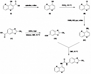 N-(2-Methylbenzoxazol-6-yl)-N’-(1,5-naphthyridin-4-yl)urea | 249889-64-3 (monohydrochloride) | C17H13N5O2 |
